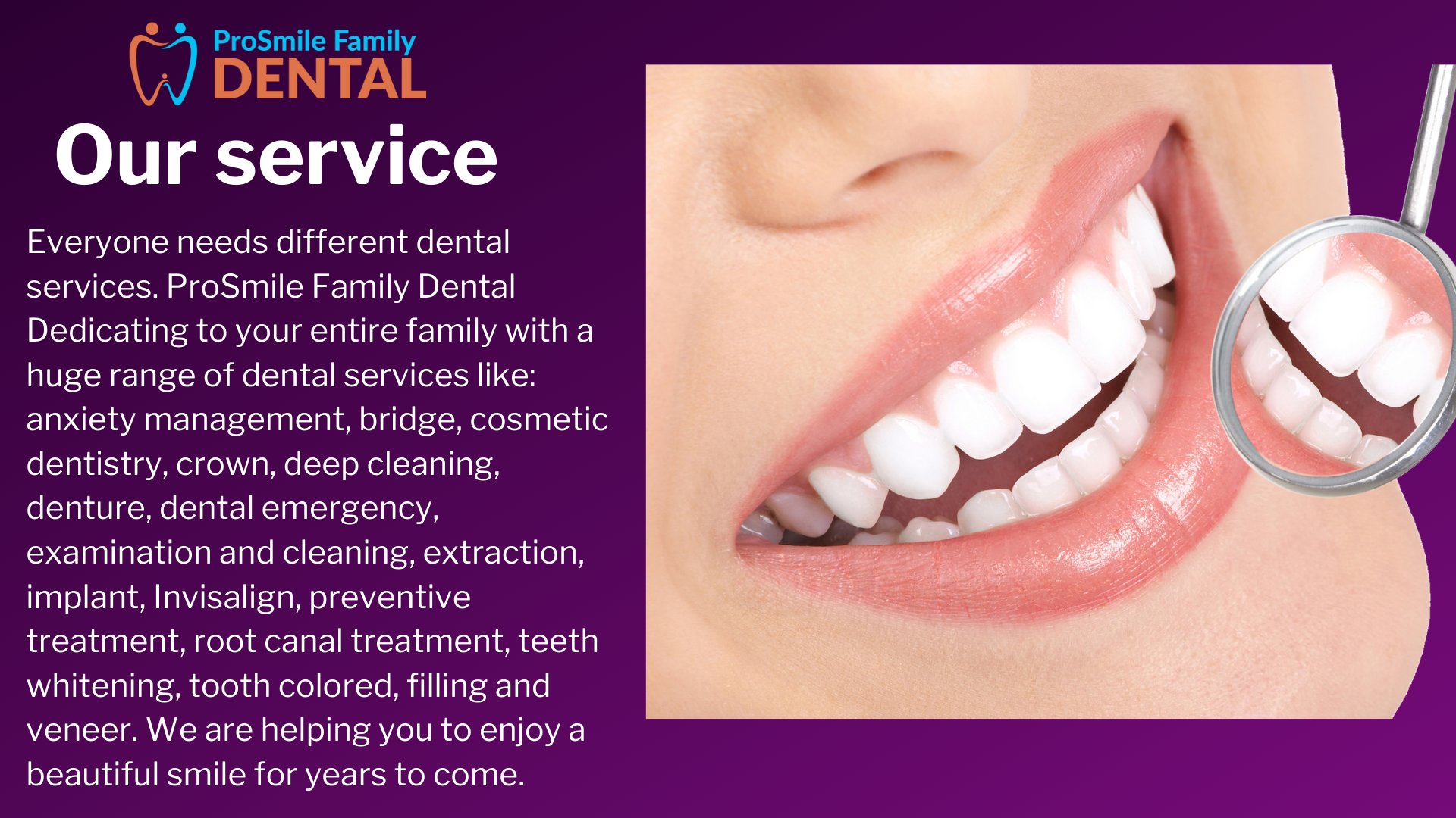 See more of ProSmile Family Dental on Facebook. More We at ProSmile Family Dental strongly believe that everyone deserves a beautiful and healthy smileThats the reason we offer complete dental services suitable for each family memberWe provide services that include preventative care to orthodontics. We at ProSmile Family Dental strongly believe that everyone deserves a beautiful and healthy smile.